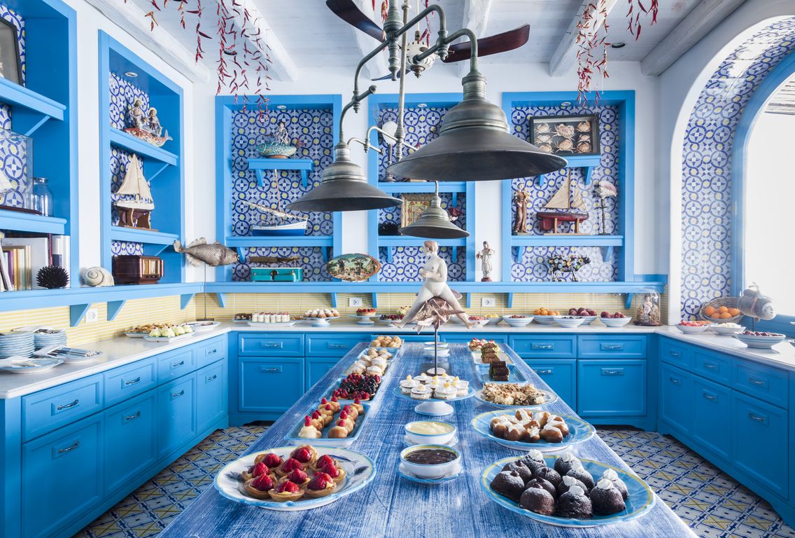 Die offenen Räume und Flächen gehen in 68 Zimmer über, die in Weiß, Blau und neutralen Farben mediterrane Atmosphäre verbreiten. Keramikfliesen und maßgefertigte Möbel verleihen den Räumen das Ambiente eines familiären Privathauses.
