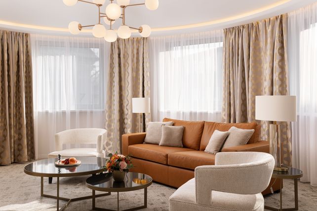 Durch die großen Erkerfenster im Wohnzimmer strömt viel Licht in die neuen Suiten. Die Suite besteht aus einem Wohnzimmer, einem Schlafzimmer und zwei Bädern, wobei das Ledersofa im Wohnzimmer in ein zusätzliches Bett verwandelt werden kann. Bucht der Gast zudem ein angrenzendes Zimmer, ergibt sich eine Familiensuite mit zwei Schlafzimmern, die durch einen abschließbaren Vorraum vom Gästeflur getrennt wird.