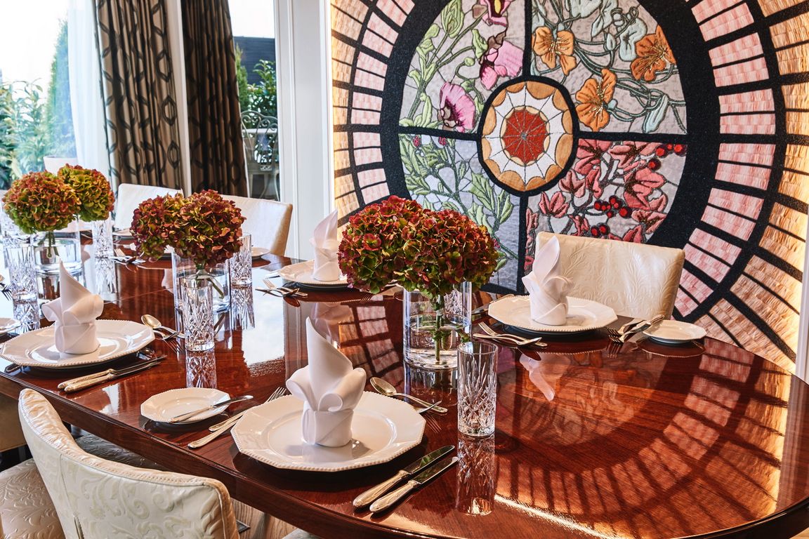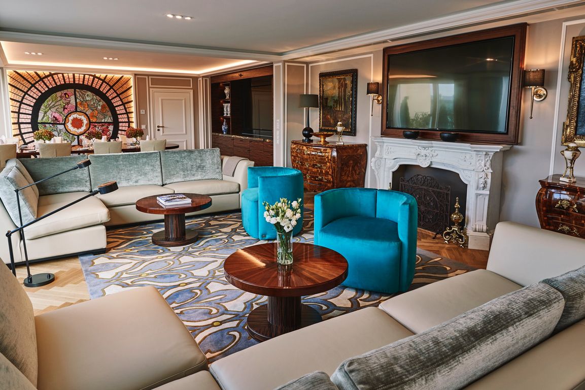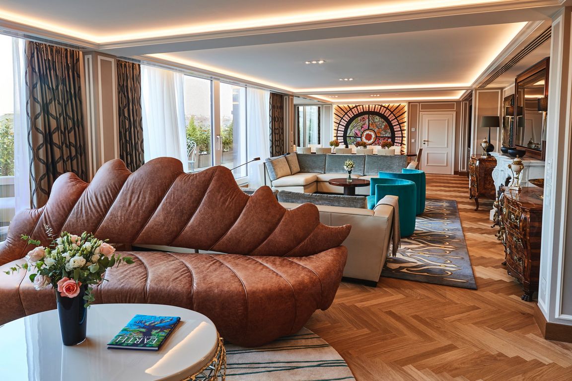 Die Maximilian Suite wurde auf der obersten Etage des Hotels mit bestem Blick auf sieben der schönsten historischen Sehenswürdigkeiten Münchens gebaut: Vom Westen reicht der Blick von der Kirche „Alter Peter“, über das Alte und Neue Rathaus, die Frauenkirche, das Nationaltheater, die Theatinerkirche bis hin zur Bayerischen Staatskanzlei. An diesem „Logenplatz“ hat der Architekt Colin Finnegan einen Ort geschaffen, der in Erinnerung bleiben soll. Individuell gefertige Meisterstücke alter Handwerkskunst und moderne Einrichtungsgegenstände sollen die Gäste zum Entdecken anregen. Im Wohnzimmer ist eine deckenhohe Vier Jahreszeiten-Stickerei ein Anziehungspunkt: Die berühmte Glaskuppel der Lobby, die Blüten aller vier Jahreszeiten zeigt, diente als Vorbild für die Stickerei. In 1.700 Arbeitsstunden entstand das Kunstwerk aus Baumwolle, Bast und Perlen.
