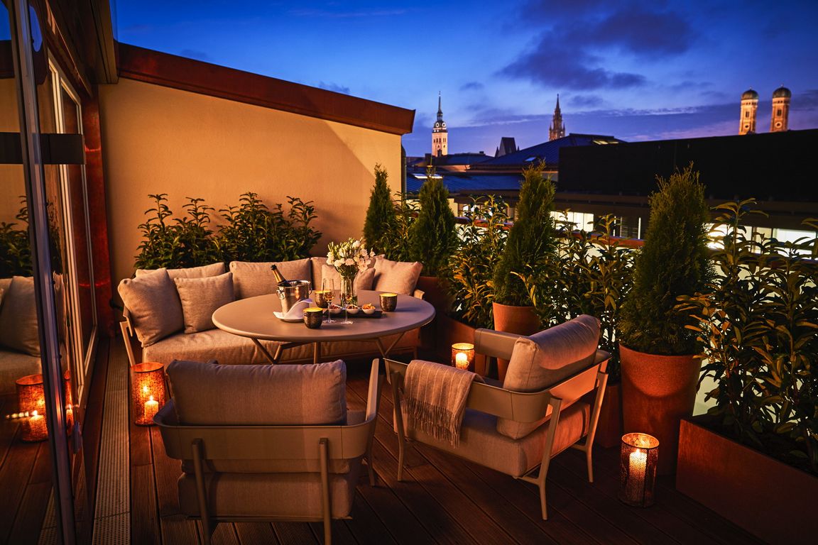 Besonderes Element ist eine Terrasse, die Gäste von einem der höchstgelegenen Orte in der Münchner Altstadt den Ausblick auf sieben Münchner Prachtbauten bietet.