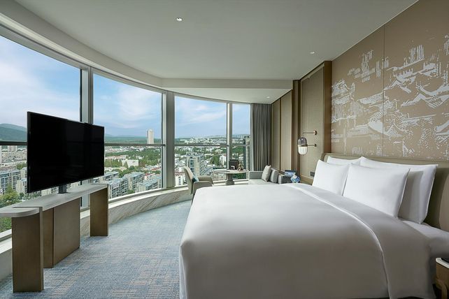 Das Design des neuen Hotels ist eine Interpretation der Pracht und Eleganz des Nanjing-Palastes aus dem 17. Jahrhundert mit seinen atemberaubenden Dächern, deren doppelte Traufen und zarten Bambusstreifen damals als eine Form der schriftlichen Kommunikation fungierten. Die 336 Gästezimmer und Suiten umfassen 11 verschiedene Zimmerkategorien und bieten einen Blick auf das Purpurgebirge und die Skyline der Stadt.