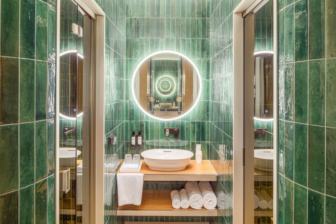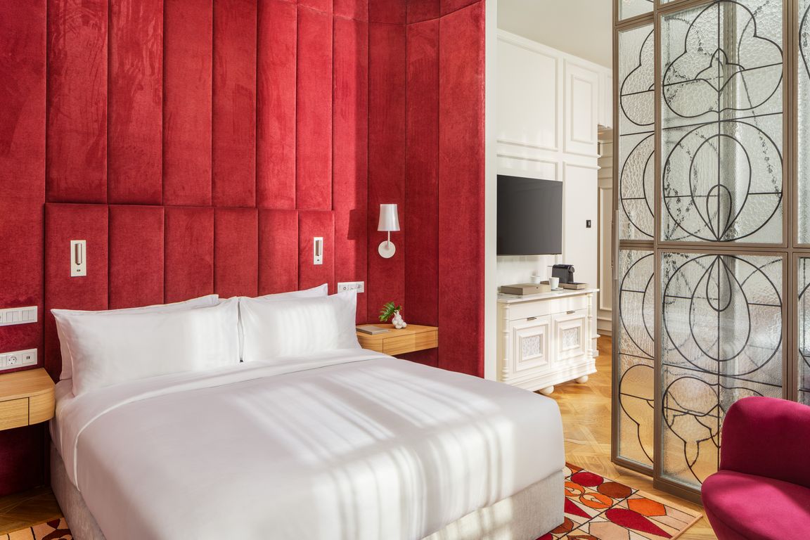 Die Muster im gesamten Hotel ehren die ungarischen Fabelwesen und die heimische Flora, darunter Illustrationen von Mohnblumen und Tulpen. Die Räume sind in einer Palette von kühlen Farben gehalten, die einen Kontrast zu den architektonischen Elementen bilden, wie einem zentralen Glasatrium mit einem Goldenen Hirsch, gewölbten Decken und üppigem Grün. Die 127 Gästezimmer, darunter 11 Suiten, bieten luxuriöse Betten und begehbare Duschen. Die Suiten sind zusätzlich mit freistehenden Badewannen und Balkonen ausgestattet. Für einen außergewöhnlichen Aufenthalt in Budapest stehen die Cosmos- und Observatory-Suiten zur Verfügung, die auf 120 Quadratmetern zwei Schlafzimmer, zwei Badezimmer, ein Wohnzimmer, ein Esszimmer und eine dazugehörige Küchenzeile bieten. Die Observatory Suite verfügt zudem über eine 82 Quadratmeter große, private, möblierte Dachterrasse, die zum Sternbeobachten und für private Zusammenkünfte einlädt.