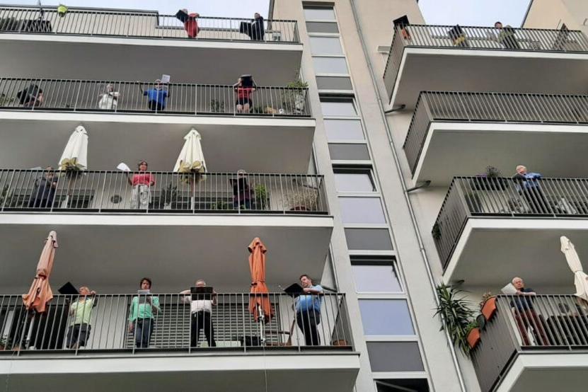 40 Chorsänger/innen stehen im Hygiene-korrekten Abstand in den Fenstern des 10-stöckigen Leonardo Hotels und singen romantische Chormusik a-cappella. Die einzigartige Akustik des Hofes eignet sich hervorragend für das Abschlusskonzert und den Schlusspunkt dieser innovativen Konzertreihe, bei der die Berliner Cappella unter der Leitung ihres Dirigenten Sergi Gili Solé in den letzten Wochen ganz unterschiedliche Fassaden in Berlin zum „Klingen“ gebracht hat. Neben Wohnkomplexen, Verwaltungsgebäuden und Gewerbehöfen fiel so die Wahl auch auf das Leonardo Berlin Mitte, dessen Akustik und besondere Atmosphäre bereits bei einer ersten Probe besonders fasziniert hatte.