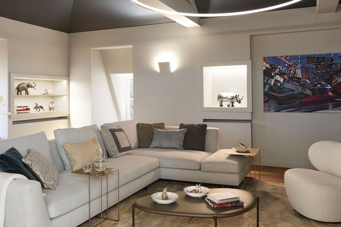 Ein noch spektakuläreres Schlosspanorama bietet das Wohnzimmer im Obergeschoss. Es ist mit einer Regalwand ausgestattet, die eine kuratierte Sammlung der beeindruckendsten Porzellanstücke von Nymphenburg enthält. Das Heimkino im zweiten Stock, das mit einer einladenden Lounge, bequemen Sesseln von Walter Knoll und einer großen Leinwand ausgestattet ist, eignet sich für private Filmabende. In einem mit Technogym-Geräten ausgestatteten Fitnessraum können Gäste zudem ihre Sportroutine aufrechterhalten. An den dazugehörigen Treatment-Bereich schließt außerdem ein Spa-Badezimmer mit Dampfdusche an.