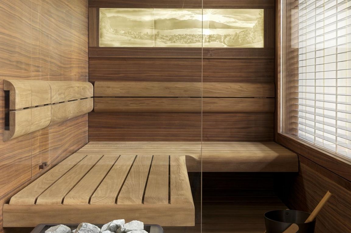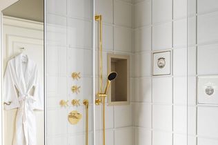 Alle sieben Badezimmer, einschließlich der beiden Gästetoiletten, präsentieren eine andere Lebenswelt. In einem der Badezimmer flattern in grazilster Handarbeit gemalte Schmetterlinge über die Wände. In einem anderen fühlen sich die Gäste wie in einem Aquarium – hier schwimmen handgemalte Goldfische über die Porzellanfliesen. Mit einem Relief in Pâte sur Pâte-Technik lässt ein weiteres Badezimmer eine subtile Safari-Kulisse entstehen. Und königlich zeigt sich das Royal Bavarian Spa im ersten Stock: Das traditionelle blau-weiße Farbschema wird durch zartes 24-Karat-Gold sowie künstlerisch gemalte Ansichten von bayerischen Schlössern wie Neuschwanstein, Hohenschwangau und Herrenchiemsee ergänzt. Der private Wellnessraum mit einer Sauna von Corso Saunamanufaktur wurde von den Mustern des berühmten „Perl”-Services von Dominikus Auliczeks inspiriert, das 1792 entworfen wurde und bis heute von der Porzellan Manufaktur Nymphenburg hergestellt wird.