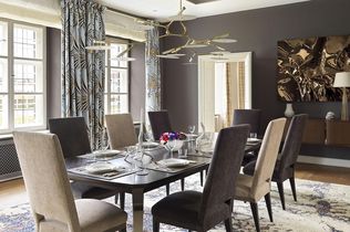 Vom Esszimmer im Erdgeschoss genießen Gäste den einmaligen Ausblick auf das prächtige Schloss Nymphenburg. Die große Tafel in der Mitte des Raumes wird von zwei Skulpturen von Damien Hirst flankiert und von einem Lindsey Adelman-Lüster aus gebürstetem Messing in Kombination mit feinstem Nymphenburg-Porzellan beleuchtet.
