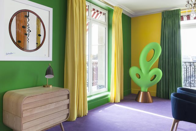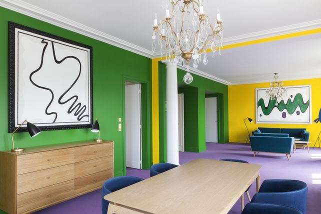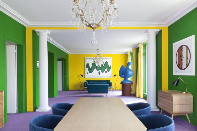 Ein Salon als Cartoon-Museum: Der Boden ist mit einem violetten Teppich überzogen, während die minimalistisch-modernen Möbel ihren Charme vor lebhaft leuchtenden gelben und grünen Wänden entfalten. Auch Farbe und Gestalt der Skulpturen sind von der berühmten Disney-Ästhetik inspiriert.