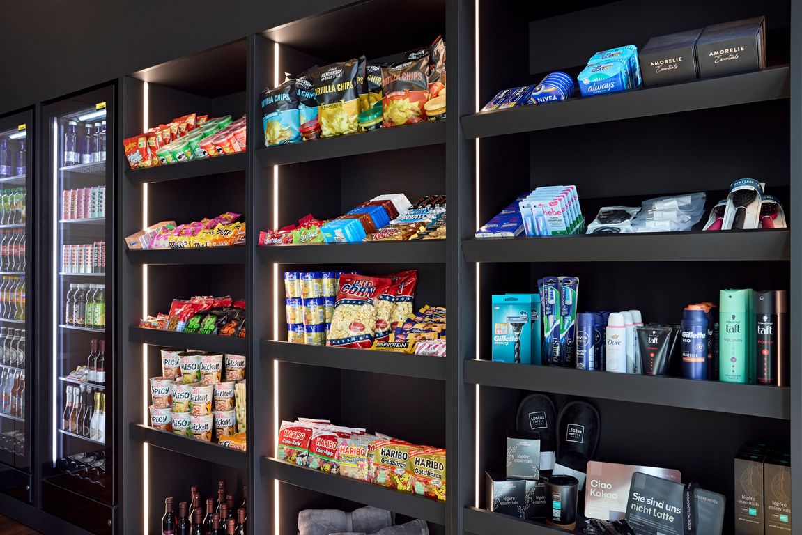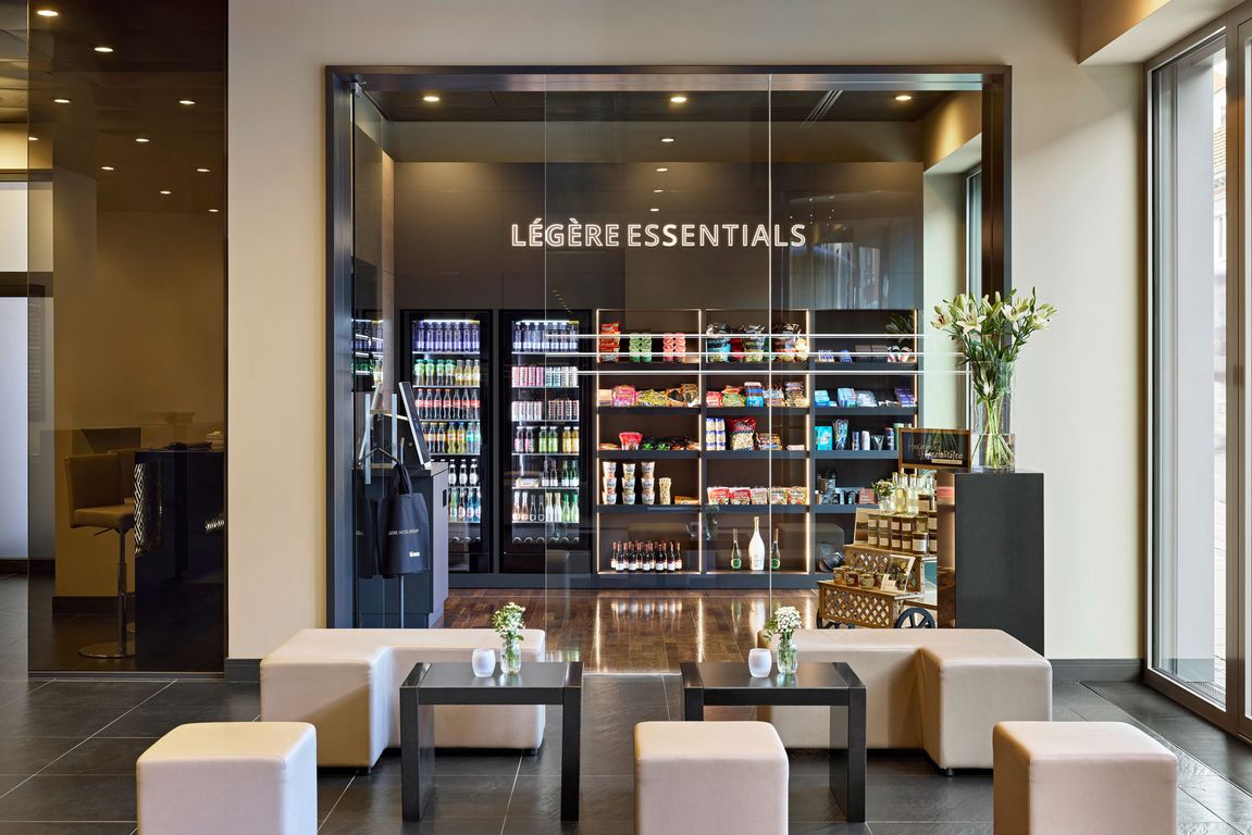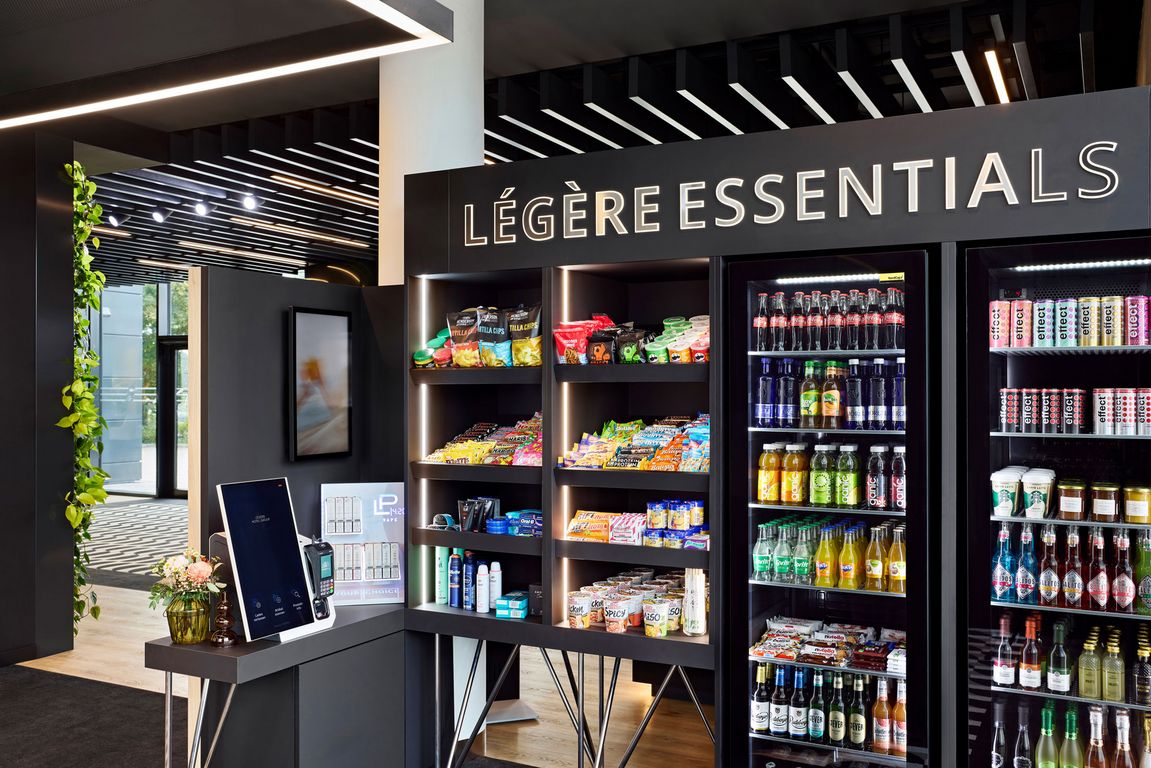 Das neue Shop-Konzept erweitert das Produktsortiment im Vergleich zur Minibar. Die Légère Essentials bieten rund um die Uhr Snacks, gekühlte Getränke, Hygieneartikel, Alltagshelfer sowie nachhaltige und regional produzierte Produkte, darunter Artikel vom Hofgut Mappen bei Wiesbaden.