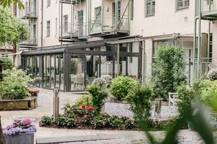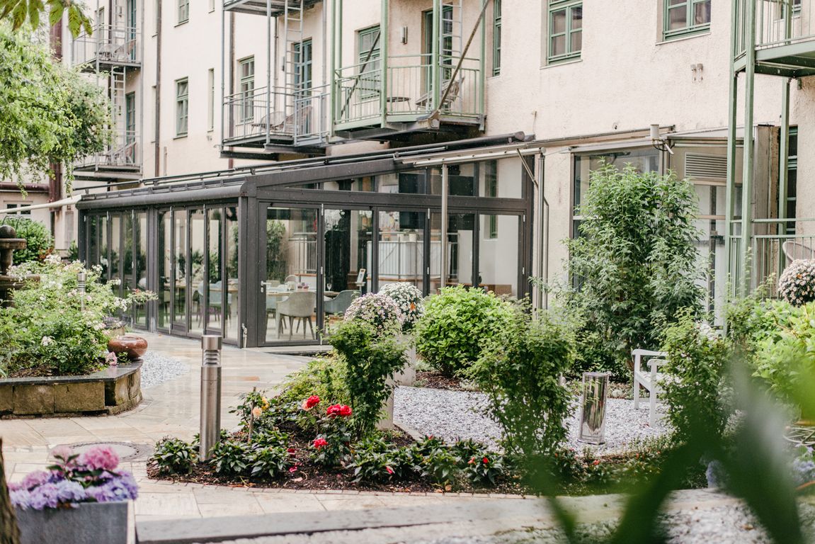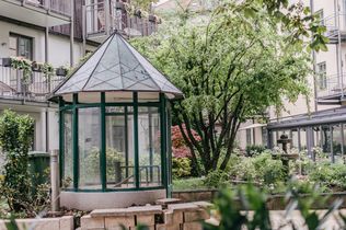 Der Innenhof mit seinem zauberhaften Rosengarten wird von einer 120-jährigen Kastanie geprägt. Begleitet vom leisen Plätschern des Springbrunnens und dem fröhlichen Zirpen der Vögel beginnt hier jeder Tag gutgelaunt und ausgeglichen. Die aufwendige, jahreszeitliche Bepflanzung setzt zusätzliche elegante Akzente. Hier vergisst man gerne die Zeit.