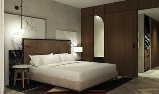In den Zimmern tauchen erneut die Moodboard-Elemente auf: Marmor hinter dem Kopfteil des Betts, aus dem Steinquader ist auf jeder Etage eine Skulptur geworden und der Bilderrahmen stellt ein unvollendetes Kunstwerk dar.