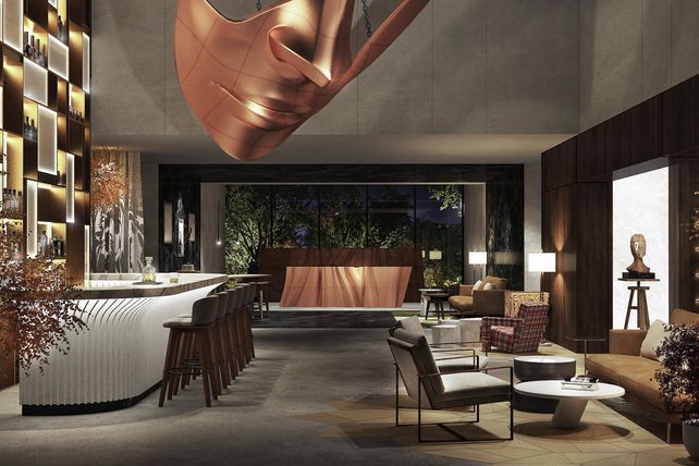 Insgesamt erstreckt sich das L’Esquisse auf sechs Etagen, wobei sich im ersten bis dritten Obergeschoß die Gästezimmer befinden; die oberste Etage nehmen die Suiten und Apartments ein. Im Untergeschoss befindet sich der Spa. Das Hotel wurde nach dem Vorbild eines Künstlerateliers gestaltet. So begrüßt den Gast im Lounge-Bereich der Lobby ein Moodboard mit verschiedenen unbearbeiteten Materialien: schwarzer und weißer Marmor, ein Steinquader und ein Bilderrahmen. Auf dem Empfangstresen steht ein Kupferblech, das an den Saum des Gewands der Freiheitsstatue erinnert. Und die „K“ Bar ziert eine riesige, vom Gesicht der Freiheitsstatue inspirierte Maske.