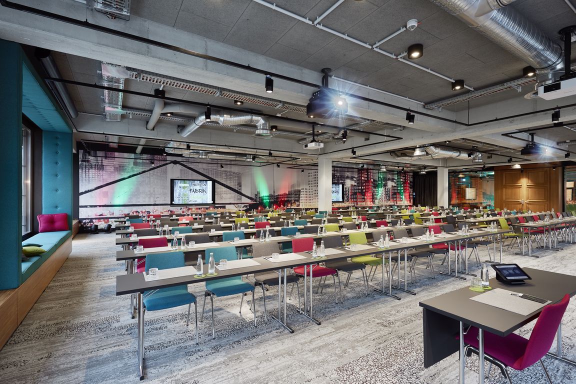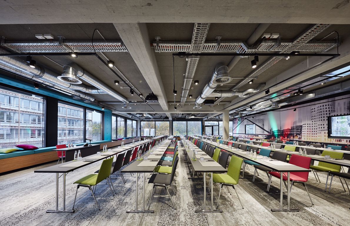 Aktuell baut das Lindner Congress Hotel den beliebten Tagungsbereich umfangreich aus. Hinzu kommen weitere Tagungsräume mit 90 bis 195 Quadratmetern im Industrie-Stil: Große Fenster mit bequem gepolsterten Sitzbänken sorgen für angenehmes Tageslicht und besondere Ausblicke. Offene Decken mit zahlreichen Rohren und Leitungen lassen die Räume luftig wirken und versprühen einen ganz eigenen Charme. Stühle und Sitzbänke in den Farben Anthrazit, Türkis, Blau und Magenta lockern das Raumdesign durch knallige Töne auf. Eine transparente bodentiefe Wand aus dichroitischem Glas bricht das hereinfallende Licht auf besondere Weise in viele verschiedene Farbtöne. Ein auffälliger Kontrast sind schließlich massive Eichenholzportale als Eingangstüren.