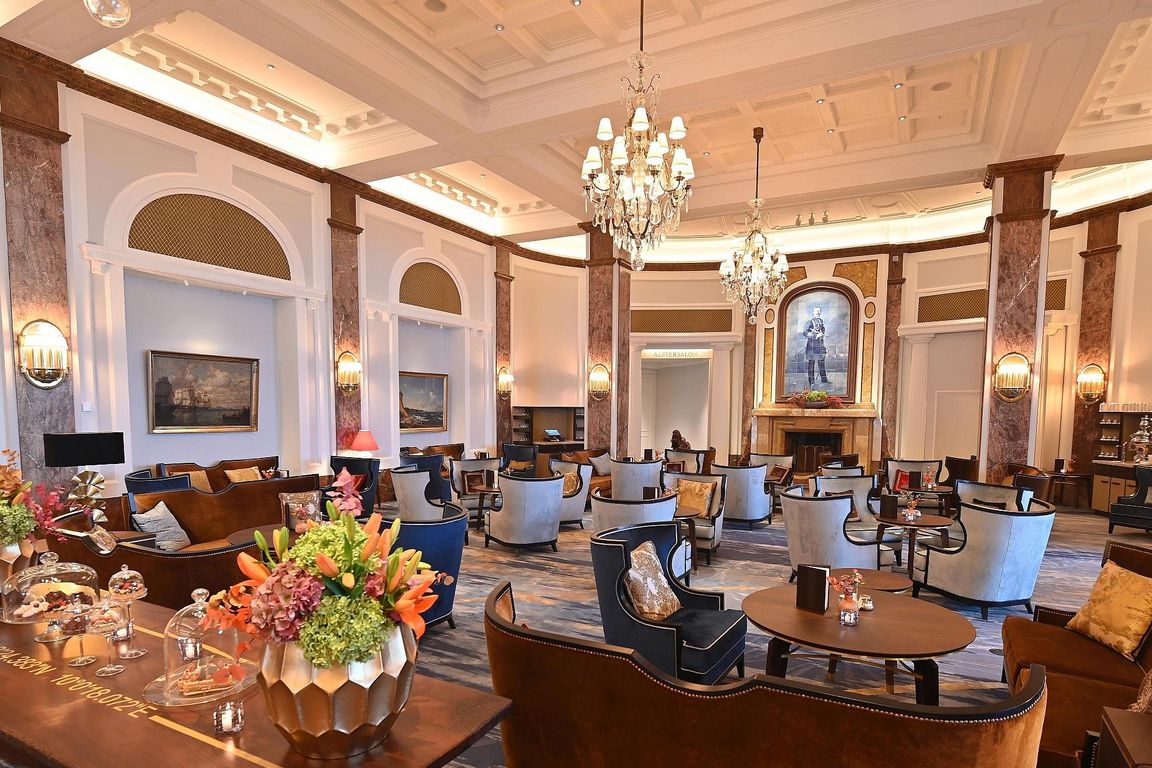 Ebenfalls verändert wurde die Rezeption, die sich wie bisher im vorderen Bereich der Lobby befindet. Hier werden die Hotelgäste nun an einem acht Meter langen Empfangstresen begrüßt und verabschiedet, der in seinem Design aus dunklem Eichenholz mit Lederbesatz und messingfarbener Dekoration an die Überseekoffer erinnert, mit denen Passagiere früher auf Kreuzfahrt gingen. In die Wandvertäfelung dahinter sind Nischen eingearbeitet, die mit maritimen Artefakten wie Kompassen oder Schiffsmodellen, das Thema des Weltendeckens und Reisens über die Meere aufnehmen.