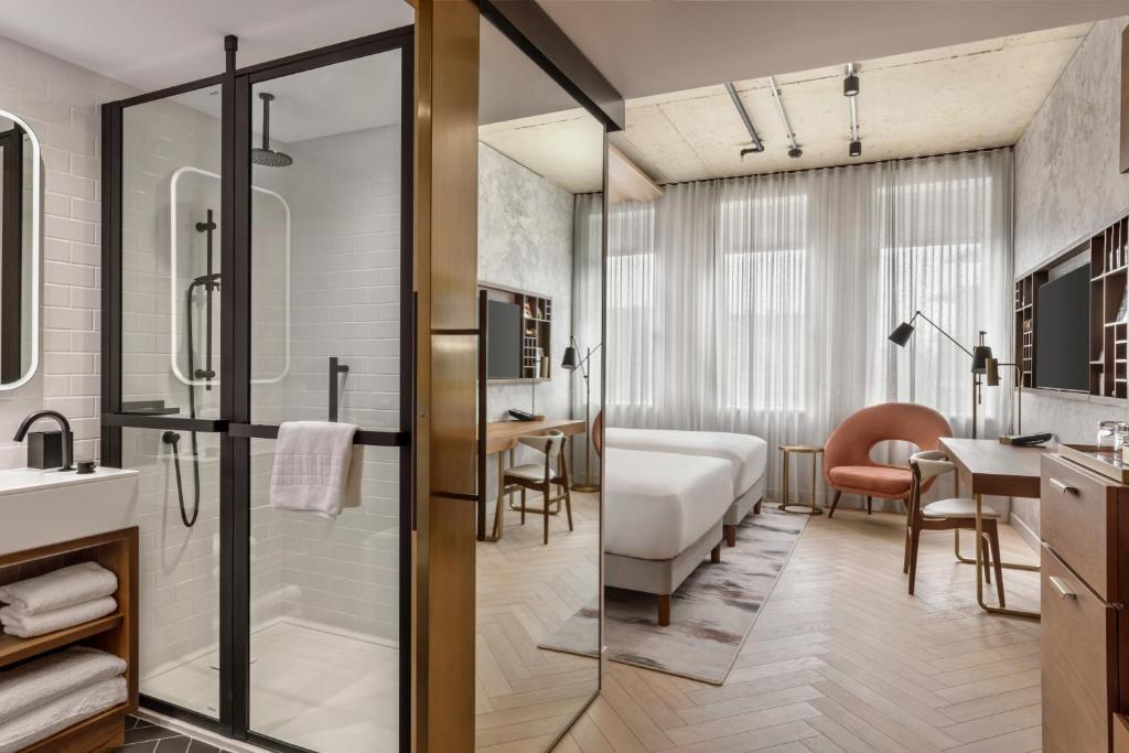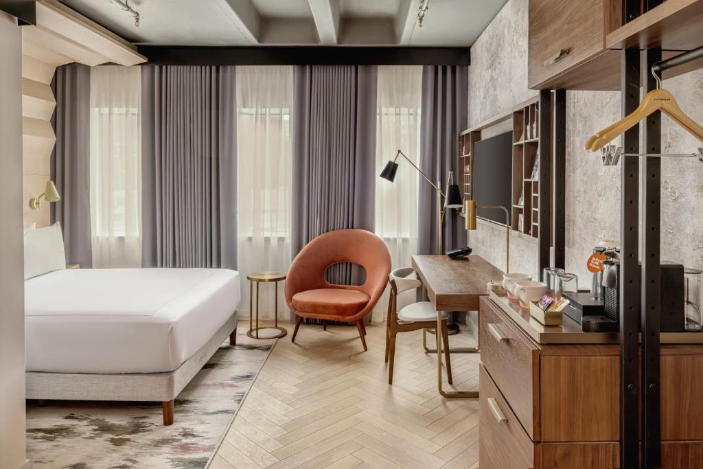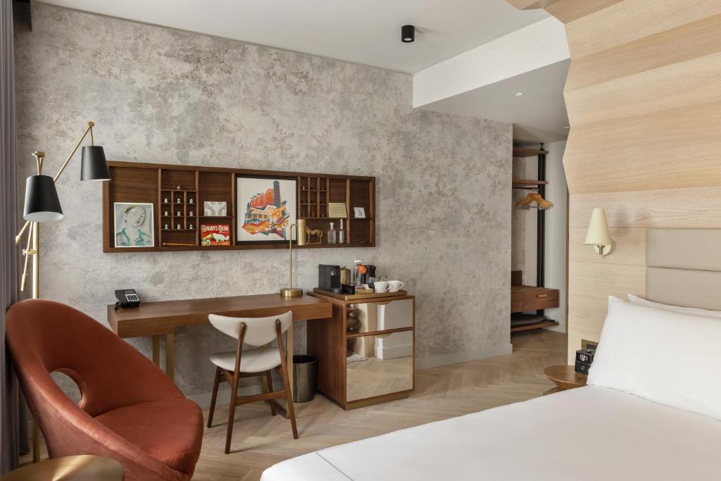 Das Interior-Design des Hotels spiegelt die reiche Kultur der historischen Textilindustrie der Region wider. Inspiriert von den hugenottischen Seidenwebern, die sich im 17. Jahrhundert in Spitalfields niederließen, finden sich in den Gästezimmern und Restaurants bzw. Bars florale Muster und gewebte Stoffe, die an die Techniken der Hugenotten erinnern. Um die zeitgenössische Kunstszene von Whitechapel zu feiern, schmücken die Kunstwerke von lokalen Künstlern die öffentlichen Bereiche des Hotels.