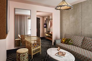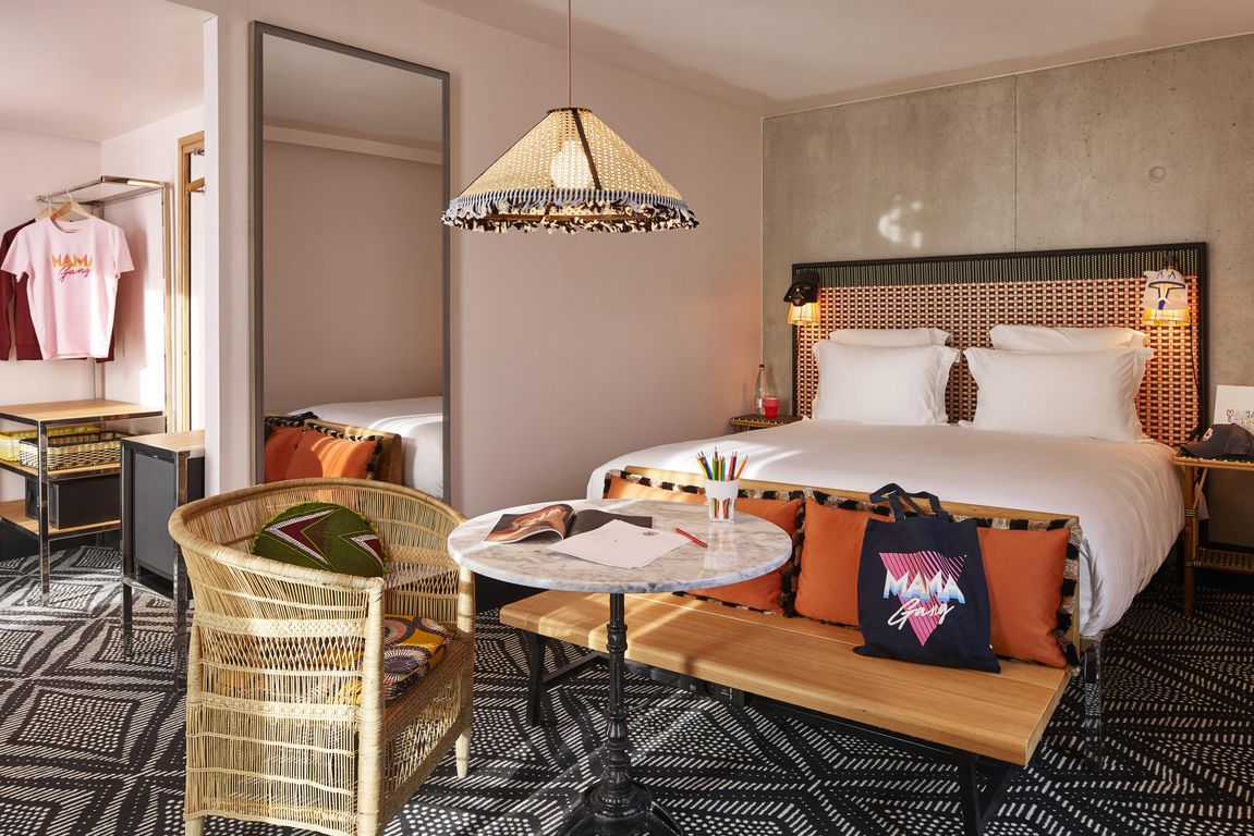 Die Architektur des Mama Shelter Paris West stammt aus der Feder von Jean-Michel Wilmotte, während die 207 Zimmer von den bekannten Innenarchitekten Dion & Arles designt wurden. Im Inneren herrscht eine wilde Mischung von Farben, Formen und Materialien wie Bast, Holz oder Stoff, die das Hotel zu einer bunten Oase machen sollen. Auch die Decke des Restaurants ist ein Hingucker: Die handgemalten Kreide-Zeichnungen auf schwarzem Hintergrund vom französischen Künstler Beniloys beherrschen den Raum und erzählen die Geschichte der Stadt sowie von Mama.