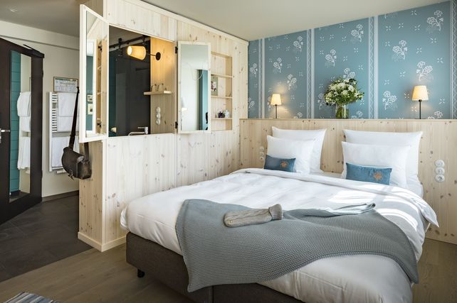 Seinen tatsächlichen Charakter bekommt ein Münchner Wirtshaus jedoch erst durch sein Interieur: So dominieren im Gastraum dunkle Hölzer sowie Grüntöne, die an das Ayinger-Logo erinnern, helle Ahorn-Tischoberflächen – traditionell in Kreuzform gekämmt – sowie Kupfer als Reminiszenz an die Braukunst. Natürlich gibt es einen zünftigen Stamm- und auch einen altbekannten „Kartltisch“. Die Wirtshausbänke wurden aufgearbeitet, die Aufhängung der neuen Rückenpolster erinnert an Elemente einer Lederhose. Überhaupt sind es auch und gerade die Details, die das „Ayinger in der Au“ zu einem Ort zünftiger Gemütlichkeit machen: So grüßen klassische Lüftlmalereien und süddeutsche „Lüsterweiberln“ – handgeschnitzte Figuren – von der Decke, oder auch ein traditioneller „Bierkrugtresor“, der Stammgästen zur Verfügung steht. Aufmerksamen Gästen fällt auch ein Wandbild auf, das mit Zitaten aus der Gegenwart einen überraschenden und augenzwinkernden Bezug zur guten alten Zeit herstellt. Verantwortlich für die Innenausstattung des Wirtshauses zeichnen die Innenarchitekten von DREIMETA – Atelier für Gestaltung, die auch das Hotel mit viel Liebe zum Detail eingerichtet haben.