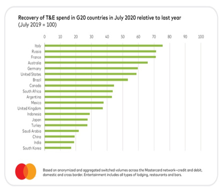 Die Analyse anonymisierter und aggregierter Konsumaktivitäten im gesamten Mastercard-Netzwerk der G20-Länder zeigt, dass sich der Tourismus in Italien, Russland und Frankreich am schnellsten erholt. Australien folgt auf Platz vier und Deutschland liegt auf dem fünften Platz. Ausgewertet wurden Reisesegmente wie Fluggesellschaften und Unterkünfte, aber auch Freizeitaktivitäten wie Restaurantbesuche. Obwohl Italien zu Beginn dieses Jahres ein Schwerpunkt der Pandemie war, haben die ausgeprägte Restaurantkultur und die umfangreiche heimische Tourismusindustrie dazu beigetragen, dass sich Italien schneller erholt als andere Märkte, wie zum Beispiel die USA, Brasilien und Indien.
