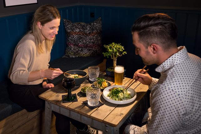 „Separées sind in klassischen japanischen Restaurants üblich und da hatten wir die Idee, Hotelzimmer in der ersten Etage zu nutzen, um dieses Erlebnis auch in Mainz zu ermöglichen“, erzählt Holger Hanselmann. Für 34,50 Euro pro Person bekommen die Gäste ein Menü mit drei Vorspeisen, einer Ramen-Hauptspeise und Dessert inklusive Wasser im private room serviert. Auf der Soundanlage im Zimmer kann dazu die eigene Musik oder eine Playlist des Hotels im Hintergrund abgespielt werden. Wer möchte, kann natürlich auch den Flat-TV im Zimmer nutzen.Weiteren Komfort bieten eigenes WC und Waschbecken.