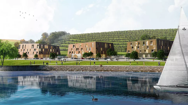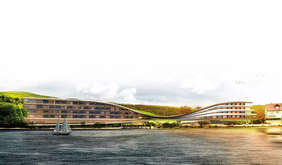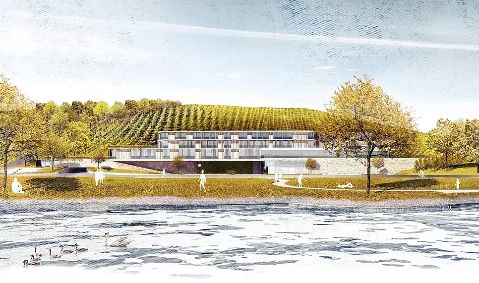 136 Zimmer, Restaurant, Bar und Café in drei geneigten, dynamischen Kuben: Die Architektin Simone Gauss von Aldinger Architekten will drei Gebäude in Holzhybridbauweise mit Holzfassaden errichten, die die Weinberge im Hintergrund sichtbar lassen. Ein 300-Quadratmeter großer Spa-Bereich kommt hinzu. Das Hotel soll dann von einer internationalen Kette betrieben werden. Investor ist die JR Real Estate, die für das Vier-Sterne-Superior-Haus auch große Suiten einplant.