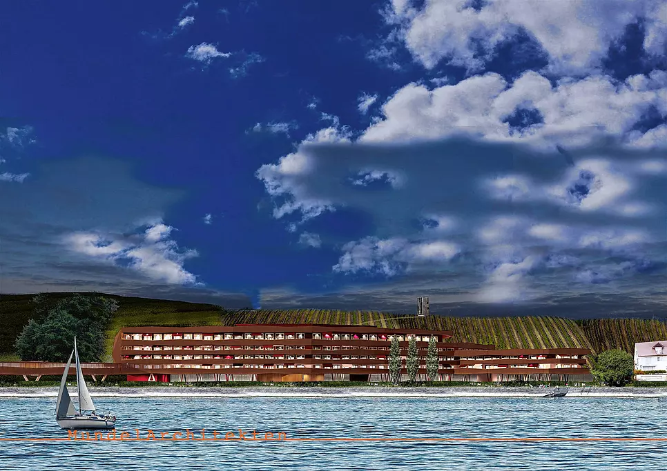 150 Zimmer, Tagungsräume, Bistro, Bar und Restaurant sowie ein kleiner Spa-Bereich mit Schwimmbecken. Der Entwurf des Architekturbüros Külby und Külby kommt spektakulär daher. Die Architekten planen eine Herberge mit 300 Quadratmeter großen Zimmern, die alle Seeblick erhalten sollen. Damit die Weinberge sichtbar bleiben, soll das Gebäude in der Mitte abgesenkt werden. Partner sollen die Titanic Hotels sein, die, meist in Berlin 14 Hotels, betreiben.