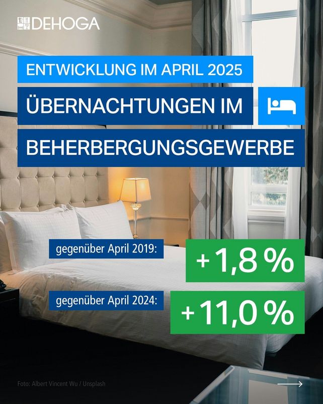 Im April 2025 verbuchten die Beherbergungsbetriebe in Deutschland 41,0 Millionen Übernachtungen in- und ausländischer Gäste. Wie das Statistische Bundesamt nach vorläufigen Ergebnissen mitteilt, waren das 11,0 Prozent mehr als im April 2024.