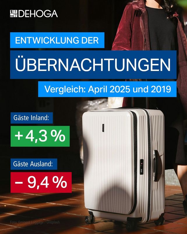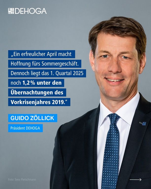 „Ein erfreulicher April macht Hoffnung für das Sommergeschäft. Dennoch liegt das erste Quartal 2025 noch 1,2 % unter den Übernachtungen des vor Krisenjahres 2019“, sagte DEHOGA-Präsident Guido Zöllick in Berlin.