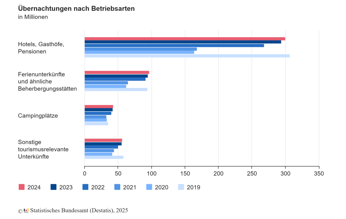 Der Blick auf die verschiedenen Betriebsarten zeigt, dass sich Betriebe der Hotellerie – also Hotels, Gasthöfe und Pensionen – weiterhin erholt haben, jedoch etwas unter dem Vorkrisenniveau von 2019 blieben. Im Jahr 2024 verzeichneten sie 2,2 Prozent weniger Übernachtungen als 2019, aber 2,0 Prozent mehr als 2023.