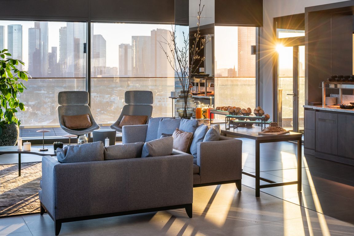Wie auch im Hotelbereich setzt das Interior-Konzept des Restaurants auf natürliche Materialien und organische Formen mit viel Tageslicht. Die elegante Gestaltung wird durch farbliche Highlights in Form von roten Samtstühlen und spanischen Wandfliesen spannend gebrochen. Die bodentiefe Panoramaverglasung ermöglicht einen Blick auf die Skyline der Stadt und den Taunus. Dank zahlreicher Spiegel an den Wänden erleben die Gäste das 360 Grad Panorama an jedem Platz.