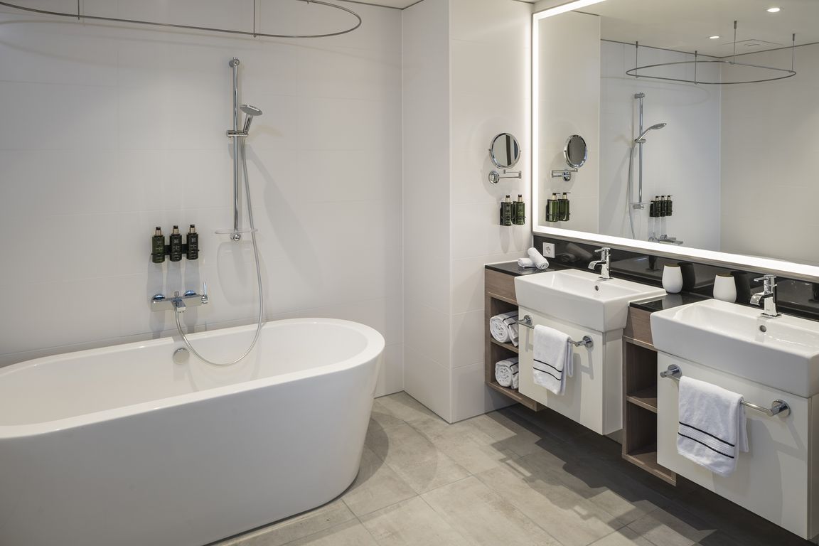 Inspiriert von der Natur, die den vollverglasten Hybridturm umgibt, ist das Interiordesign des Hauses minimalistisch, luftig und natürlich. Durch das Raum-Bepflanzungskonzept verschwimmen die Grenzen zwischen Outdoor und Indoor. Elemente wie der Pucida-Baum im Empfangsbereich übermitteln den mediterranen Flair der spanischen Gruppe. Die Zimmer sind in einem puristischen Design gehalten und verfügen über einen Flachbild-TV, eine Minibar, einen Safe sowie Highspeed-WLAN in allen Kategorien.