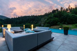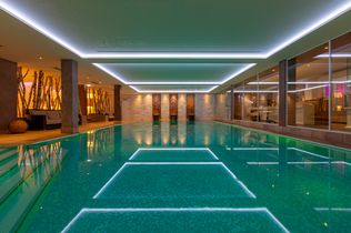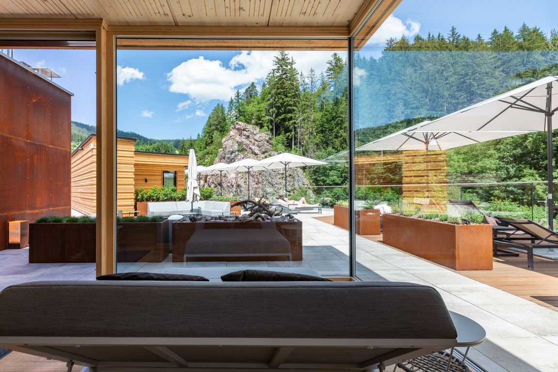 Eine der wichtigsten Komponenten der Investitionen war die Errichtung des An- und Neubaus „Murgtal", der mit seiner schwarzen, leicht gekippten Holzfassade besonders ins Auge fällt. In zwei Obergeschossen sind hier 15 neue Juniorsuiten mit eigenen Loggien untergebracht, deren Vertäfelung aus heimischer Weißtanne sich kontrastreich absetzt. Auch die Fassaden des Haupthauses, mit seinem typischen Schwarzwald-Look, wurden energetisch und optisch renoviert – alles bildet nun ein harmonisches Ensemble. Auf der vierten und fünften Etage befindet sich das neue Wellness-Highlight des Romantik Hotel Sackmann: der „Murgtal-Sky-SPA“. Auf rund 1.000 Quadratmetern und zwei Ebenen erwartet die Gäste hier ein Maximum an Erholung, die auf der Dachterrasse mit dem spektakulären, 60 Quadratmeter großen „Sky- Infinity-Pool“, der 360-Grad-Panorama-Sauna und dem Barfuß-Sky-Walk ihren Gipfel findet. Außergewöhnliche Ruhebereiche und Chill-Out-Lounges mit spannenden Themen wie Kerzen- oder Feuerlounge, runden das Wohlfühl-Erlebnis ab.