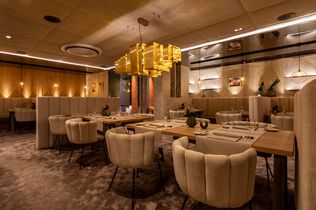 Um der „ausgezeichneten“ Kulinarik aus den Händen von Sternekoch Jörg Sackmann und Sohn Nico einen angemessenen Rahmen zu geben, wurden im Zuge des Umbaus alle vier Restaurants – das Gourmetrestaurant Schlossberg sowie die Restaurants Murgstube, Silberberg und Haselbach mit Marktbuffet, inklusive der Küchen mit komplett neuer, technischer Ausstattung im Parterre, platziert. Auch hier überzeugt die Einrichtung mit modernem Design mit viel Holz und sympathischen Reminiszenzen an den Schwarzwald. Ebenfalls im Erdgeschoss: die neue, großzügige Eingangshalle mit Rezeption und einer erweiterten Lobby mit Weinlounge, Kochbuch-Bibliothek, Kaminzimmer und Sackmanns Genusswelten-Shop. Angeschlossen darüber hinaus die neue, „gläserne“ RheinHOLZ Café & Bar, die spektakulär in verschiedenen Lichttönen erstrahlt.