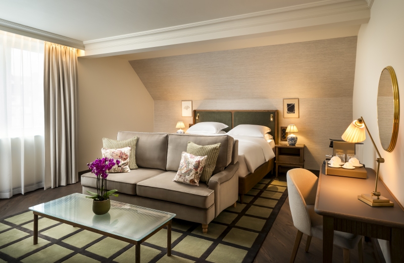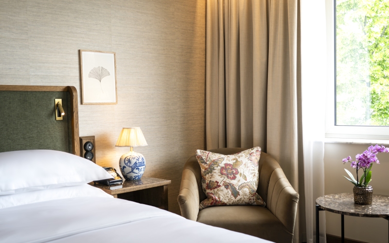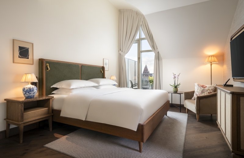 Im Stile des Art Deco sind die 127 Zimmer und Suiten des Brunfels gestaltet, die eine Verbindung zwischen Eleganz und Natur schaffen. Zu den beliebtesten Kategorien zählen die King Zimmer mit Balkon, von denen Gäste aus unter anderem den Dom St. Martin sehen. Die Terrassen eigenen sich im Sommer für einen Aperitif mit Blick über die Dächer der Landeshauptstadt genauso wie für ein romantisches Frühstück. Warme Holzelemente, sanfte Farbtöne und lichtdurchflutete Räume prägen die Rückzugsorte. Sie vermitteln ein Gefühl von Geborgenheit und laden zum Entspannen ein. Weiteres Highlight: die modernen Bäder mit Regendusche und edlem Marmor.