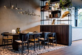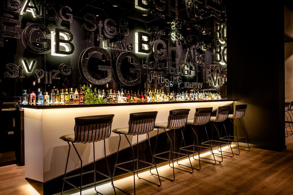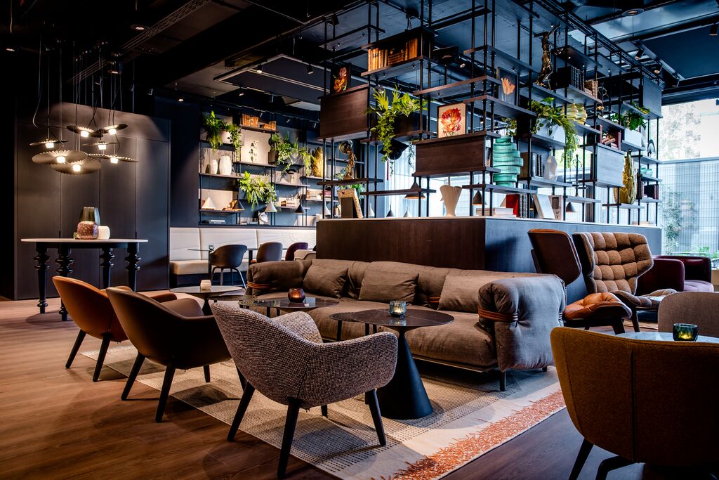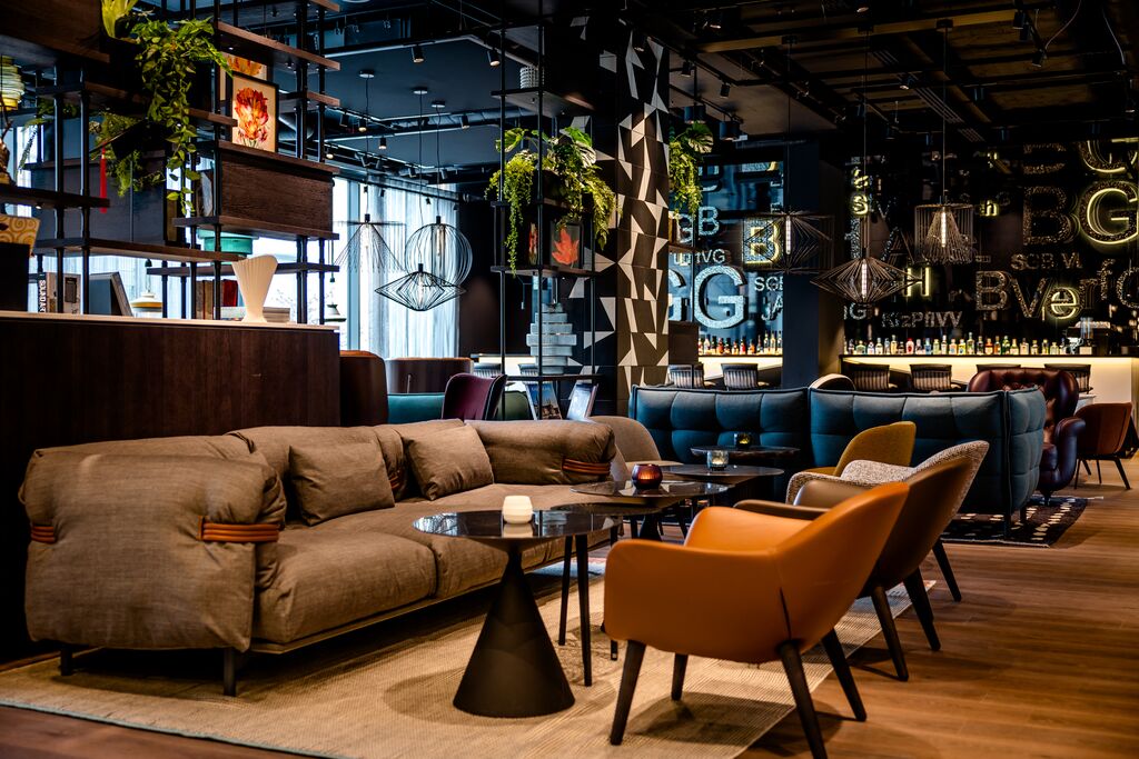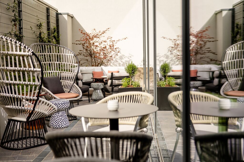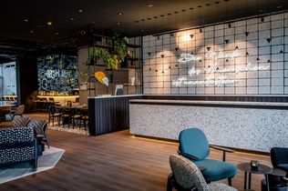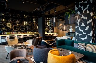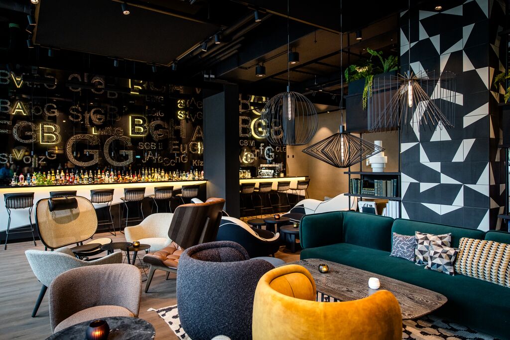 Im Frühstücksbereich der Lounge sind Stühle entlang kleiner Tische mit braunem Leder bezogen und ähneln den Einbänden alter Rechtsbücher. Auf der gegenüberliegenden Sitzbank ist das grobe Muster der Straßen verewigt, die bekannterweise die Form eines Fächers ergeben. Die unterschiedlichen Materialien an der Front der Kaffeestation wurden vom Muster des Platzes vor dem Bundesverfassungsgericht inspiriert. Von hier kommt man auf die begrünte Außenterrasse, die zu einem entspannten Drink in der Sonne einlädt. Im neuen Motel One Karlsruhe befindet sich zudem eine einladende Bar.