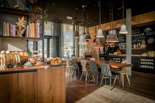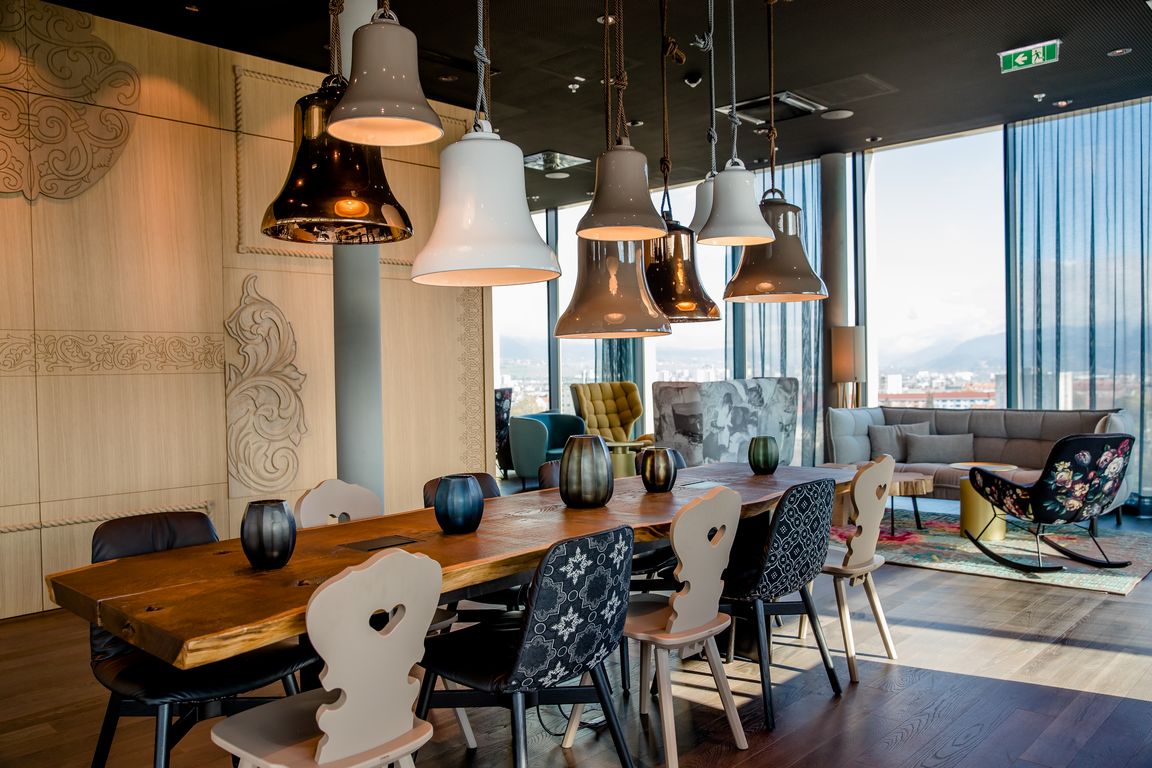 In der Lounge werden metallische, moderne Oberflächen gegensätzlich mit Leuchten von Bocci, die von der Form an Wolken erinnern, alpenländischen Bezügen von Backhausen und Teppichen im Natur-Stil von der Firma Gan ergänzt. Im Frühstücksbereich, in der sogenannten „Tiroler Stube“, können Schnitzereien und Glockenleuchten bewundert werden.