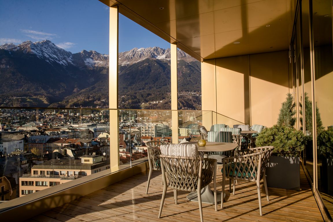 Den Abend können Hotelgäste in der Cloud One Bar ausklingen lassen. Die Panoramabar im 13. Stock bietet einen Ausblick auf die Bergspitzen über den Dächern der Stadt. Die Innsbrucker Künstlerin Nicole Weniger unterstreicht mit der Gestaltung der Barrückwand die Symbiose von urbanem Ambiente und ländlicher Bergnatur.
