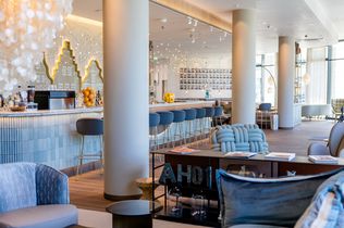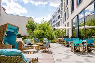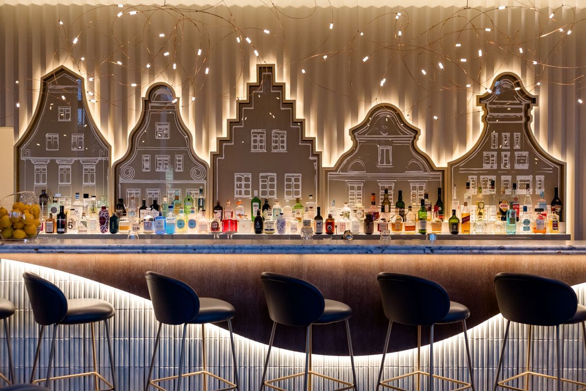 Auch die Bar passt sich an das Design der Rezeption an, bezieht sich aber thematisch auf die ganze Hansestadt Rostock. Häusersilhouetten zieren ihre Rückwand und laden zu einem Drink mit Blick auf die Innenstadt ein. Die handgemachten Fliesen des Tresens transportieren dabei den Anschein des Wassers der Warnow. Auch die Möblierung setzt mit aquamarinen Tönen das Thema Wasser weiter um, wobei sie durch Sandfarben aufgehellt wird.