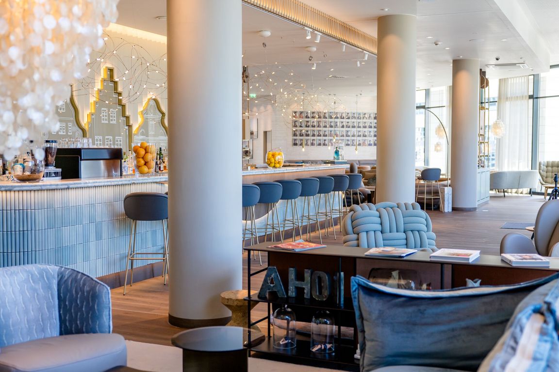 Die Umgestaltung wurde auch genutzt, um die Raumaufteilung zu optimieren und ein offeneres Ambiente wie auf hoher See zu erschaffen. Rezeption, Bar und Kaffeestation sind deshalb neu angeordnet. Neu ist außerdem ein zusätzlicher Meetingraum. Wie auch im Motel One Brüssel wurde ein Großteil der Möblierung für die neue Gestaltung aufgearbeitet und wiederverwendet. Darunter die vielen Muschelleuchten und -vorhänge, die mit ihrer Perlenfarbe Eleganz und Lichtreflektionen in das Design bringen. Ein Hingucker ist der Lounge Sessel von Moooi, der aus extra großem „Garn“ an riesige Schiffstaue erinnert.