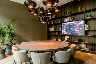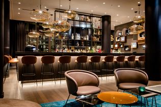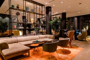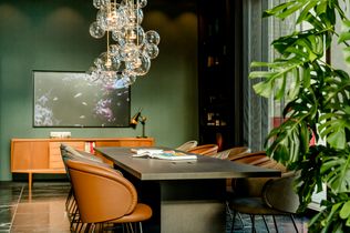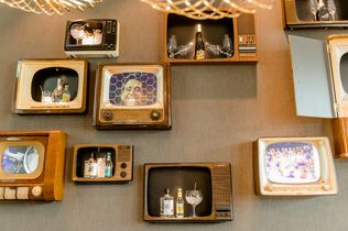 In der One Lounge entsteht durch ausgewählte Materialien, Sideboards aus den 1950er- und 1960er-Jahren sowie hochwertige Textiltapeten mit Mustern der wohnliche Charakter, der auf die Entstehungszeit der modernen Fernsehkultur anspielt. Ein Highlight ist der Sessel „Paradise Bird“ von Wittmann, der erst im vergangen Frühjahr auf der imm cologne zu sehen. Weitere Sofas von Baxter, Leuchten von Tom Dixon und Quasar sowie Vintage-Teppiche von Mohebban runden das Design ab. Zur Wohlfühlatmosphäre trägt auch die üppige Begrünung bei. Diese erinnert an die Wohnzimmerpflanzen, die früher mit Stolz nicht nur in den Blumenfenstern der Wohnhäuser zur Schau gestellt wurden.