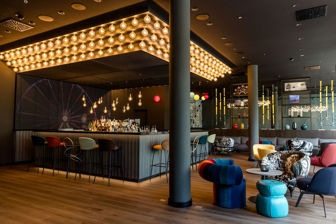 Das Redesign des Motel One Wien-Prater zeichnet sich durch farbenfrohe Designmotive aus, die durch den Charme des beliebten Vergnügungsviertels inspiriert sind. In der Lobby werden die Gäste vom Schriftzug „Prater“ in überdimensionalen Lettern hinter der Rezeption in Empfang genommen. Weiter geht es im Eingangsbereich mit ausgesuchten Designelementen. Vor einer beeindruckenden LED-Installation mit Impressionen aus dem Prater mit seinen blinkenden Lichtern und Fahrgeschäften, begrüßen historische Schiffsschaukeln und Karussellpferde die Gäste. Sie weisen den Weg in das optische und kommunikative Herzstück des Hotels.
