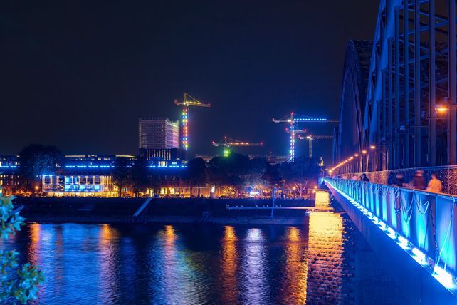 Ein besonderes Highlight auf dem MesseCity Grundstück ist die kunstvolle Inszenierung von vier Kränen. Diese erstrahlen in farbigem Licht und erzeugen gerade jetzt, in der dunkleren Jahreszeit, eine effektvolle Stimmung auf der Baustelle. Das Baufeld West 1-3 der MesseCity war im August Teil des spektakulären Gesamt-Lichtkunstprojekts „Light it up!“, das die Stadt Köln anlässlich des zehnjährigen Jubiläums der Computer- und Videospielmesse „Gamescom“ initiiert hatte. Dafür hatte der Hamburger Theatermacher und Lichtkünstler Michael Batz das gesamte Areal von der Deutzer Brücke bis zur Zoobrücke beidseitig des Rheins farbig illuminiert, darunter auch vier Kräne auf dem MesseCity-Gelände, die auch nach der Gamescom weiterhin bunt leuchten.
