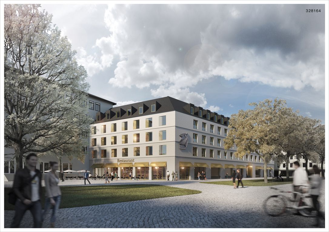 Der geschichtsträchtige Paradeplatz profitiert erheblich von dem Projekt. Die offen gestaltete Fassade des neu errichteten Teils des Ensembles ist einladend und modern: Bodentiefe Fensterfronten, messingfarbene Paneelen und elegante Markisen verbreiten regelrecht Wohlfühlatmosphäre. Bewusst wurde die Architektur zurückhaltend gestaltet, um eine dezente Kulisse für den Dom zu kreieren. Entsprechend fügt sich das schwarze Schieferdach mit seinen Gauben perfekt in die Umgebung ein, ohne dem Dom die Show zu stehlen. Indem die Flächen am Paradeplatz vorwiegend für Hotel und Gastronomie genutzt werden, entsteht eine lebendige Wechselwirkung zwischen Gebäude und Platz und damit im Ergebnis ein attraktiver Anziehungspunkt in prominenter Nachbarschaft.