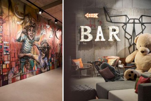 Zwei Designthemen spielen eine besondere Rolle: „The bull & the bear“ (Deutsch: Der Bulle und der Bär) symbolisieren die schwankenden Kurse an der Frankfurter Börse. So zeigt raumübergreifende Streetart des international anerkannten Künstlerduos Herakut, das seine Wurzeln in Frankfurt hat, im Eingang zwei spielende Kinder mit Bären- und Bullenkappe. Eine geometrisch abstrakte Wandgestaltung in Form eines Bullen ziert eine Sichtbetonwand in der Lobby und hiervor sitzt ein übergroßer Teddy und empfängt die Gäste. Das zweite große Designthema arbeitet die Geschichte des Gebäudes auf. In diesem saß lange Zeit die Redaktion der „Frankfurter Rundschau“. Daher spielen die Themen „Typographie“ und „Zeitung“ eine wichtige Rolle.