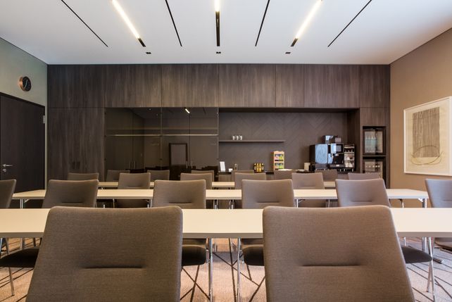 Das direkt anliegende Wohnzimmer mit Tagesbar und Kamin ist der ideale Rückzugsort: Die komfortable Sitzlandschaft bietet den idealen Ort zum ruhigen Arbeiten am Laptop, zu Vier-Augen-Gesprächen oder auch für entspannte Zurückgezogenheit mit Buch oder einer Zeitung.
