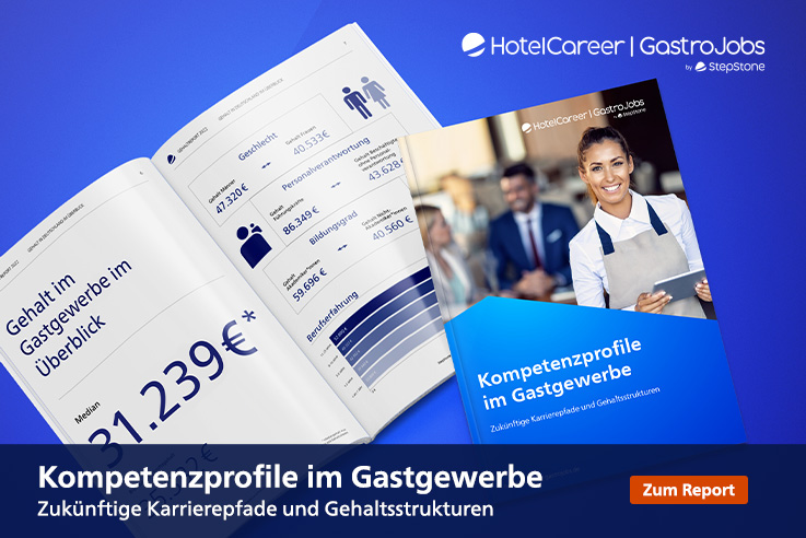 Neben Angaben zu Durchschnittsgehältern bietet der Report „Kompetenzprofile im Gastgewerbe“ zahlreiche Infos zu den zukünftigen Anforderungen an die Berufsprofile der Branche. Ansprüche ändern sich, neue Kompetenzen sind gefragt, digitale Inhalte nehmen einen größeren Raum ein. Einen Überblick, wie diese Anforderungen aussehen an der Rezeption, in der Küche, im Service und weiteren Bereichen gibt es komprimiert im Hotelcareer | Gastrojobs-Report „Kompetenzprofile im Gastgewerbe“. Am besten die Studie jetzt direkt kostenfrei herunterladen und wertvolle Informationen erhalten.