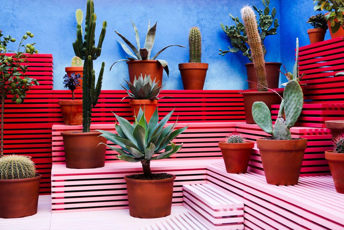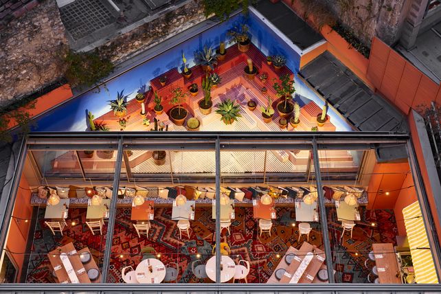 Der aus kleinen Stücken unterschiedlicher Teppiche bestehende Bodenbelag in Rosatönen etwa erinnert an einen nordafrikanischen Souk. Auf den verschachtelten Absätzen reihen sich Sukkulenten aneinander. Diese gedeihen typischerweise im südlichen Mittelmeerraum. Wer nach oben blickt, sieht eine blaue Decke, die dem Himmel über dem Meer täuschend ähnlich ist. Als die Mitarbeiter die Terrasse zum ersten Mal sahen, dachten sie, diese sei gar nicht überdacht. Tatsächlich lässt sich, je nach Wetter, das Dach schließen oder zurückfahren.