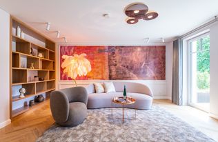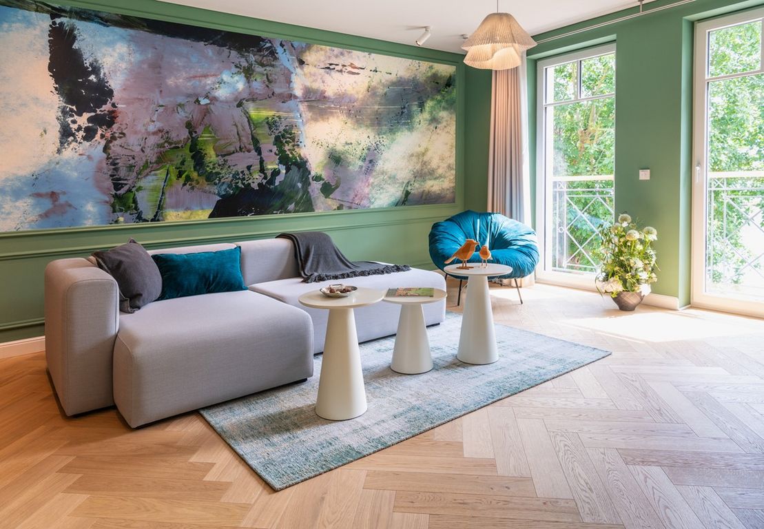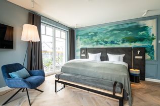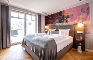 Die Ausstattung der Räume ist gehoben und individuell, die Parkettböden hochwertig in Fischgrat, Strukturwände und Kassettierungen an den Wänden unterstreichen die Wertigkeit. Die großformatigen Gemälde in allen Suiten stammen von dem Freiburger Künstler Uli Hack. Waschtische in Marmor-Optik stimmen auch die Bäder optimal auf die Zeit nach der Jahrhundertwende ab. Entworfen wurden die Bäder von kplus konzept.