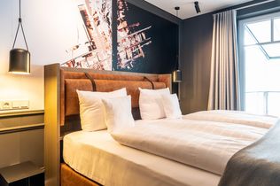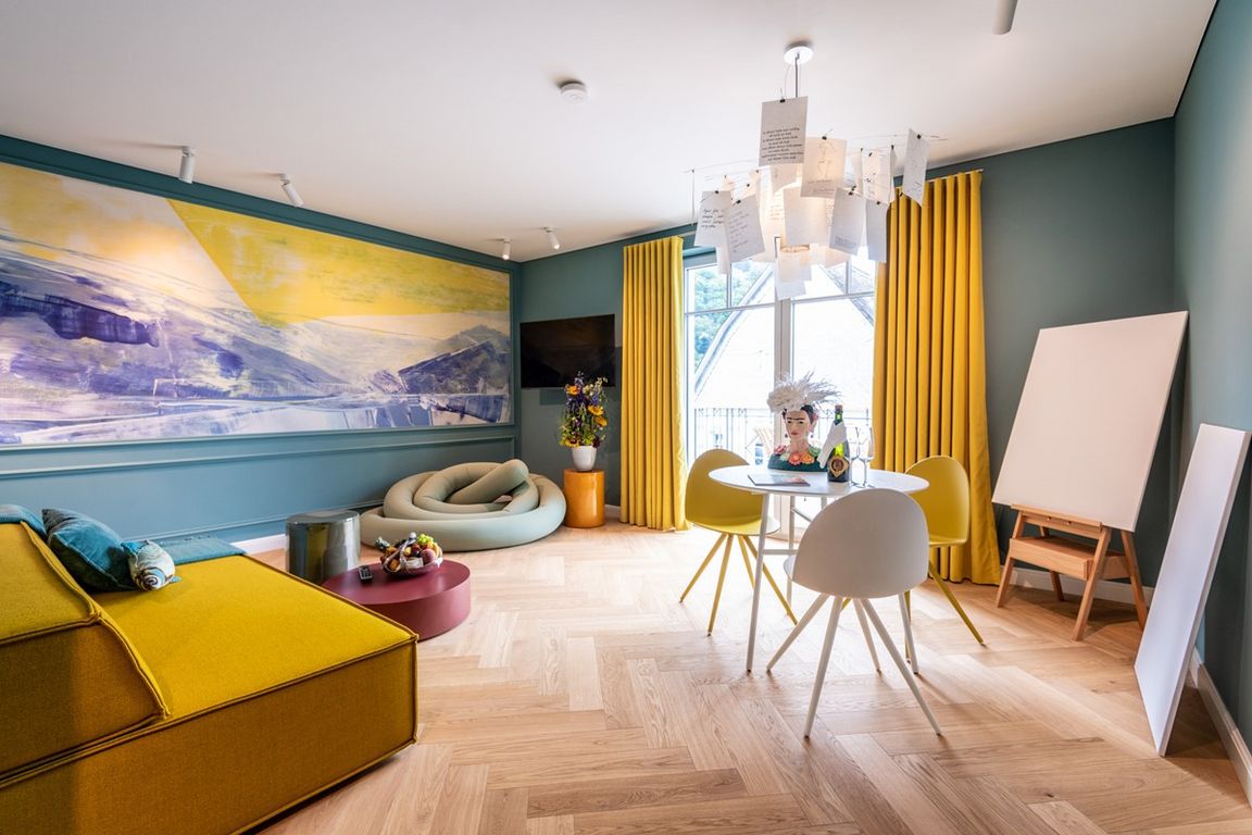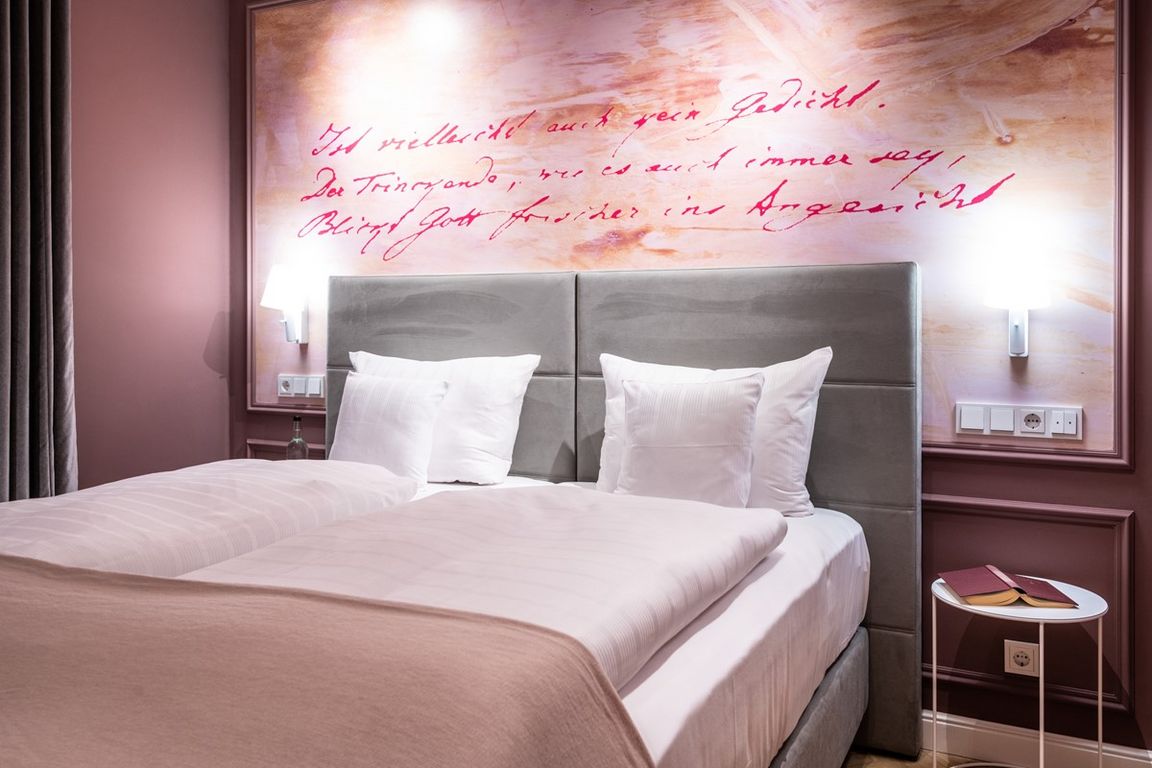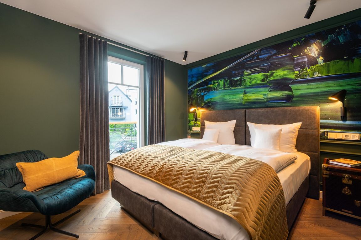 Die Ausstattung jeder der zehn Suiten bietet jeweils Einblick in ein gesellschaftlich relevantes Thema aus der Zeit der Jahrhundertwende, übersetzt auf den Stil der Gegenwart und die Ansprüche an einen modernen Gästebetrieb von heute. Da begegnet der Gast im ‚Kunstkabinett‘ der Malerin Frida Kahlo – in Form einer Büste. Das Architekturkabinett feiert Bruno Möhring und dessen Architekturstil. Im Musikkabinett steht ein Klavier, das Literaturkabinett, das alte Werke der Schriftstellerfreunde Kaysers bis hin zu aktuellen Themen der Literatur bereit hält, strahlt Ruhe und Besinnlichkeit aus. Und ein expressives Gemälde im ‚Wanderkabinett‘ erinnert nicht zufällig an das legendäre Karomuster der Marke Burberry, die für ihren Outdoor-Look berühmt ist und Anfang des 20. Jh. bereits international expandierte.