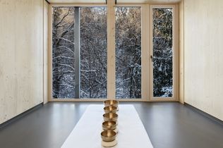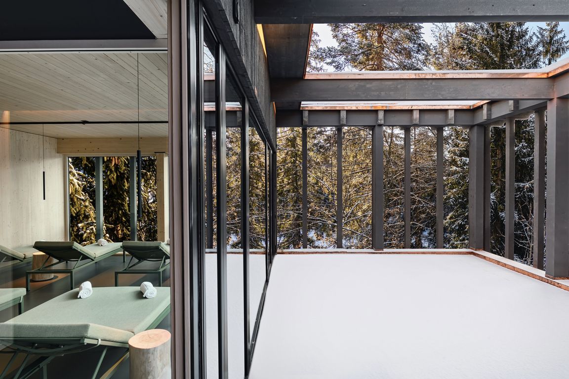 Die hölzernen Gänge sind dunkel, die Schritte gedämpft, als liefe man auf Schnee – plötzlich eröffnet sich einem ein großer Raum, so strahlend hell, als befände man sich im Zentrum des Lichts. Die großen Fensterfronten geben den Blick frei auf auf die altehrwürdigen Bäume des Hotelparks, als säßee man mitten im Wald. Der Meditations- und Yoga-Raum, passend Waldraum genannt, ist nur eines der Highlights des neuen Badehauses im Schweizerhof Flims.