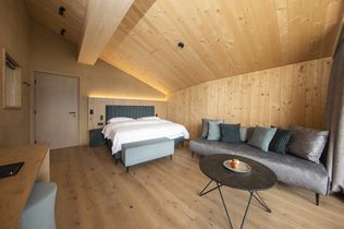 Die Küchenphilosophie unter Chefköchin Petra Patscheider fokussiert sich ebenfalls auf regionale und nachhaltige Produkte, die überwiegend von Produzenten aus dem 30-Kilometer-Radius bezogen werden. Das kulinarische Angebot reicht vom Frühstück mit Live-Kochstationen über nachmittägliche Snacks bis hin zum Abendessen, das sowohl am Tisch serviert als auch an einer Show-Küche zur Auswahl angeboten wird. Für die jüngsten Gäste sind ein Mittagessen inkludiert sowie Hochstühle, Lätzchen und Baby-Gläschen verfügbar. Eine Saftbar bietet ganztägig Sirup und Eis auf Basis regionaler Zutaten an.