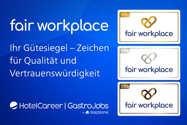 Hotelcareer | Gastrojobs by StepStone unterstützen Unternehmen und Arbeitssuchende, den richtigen Match zu finden. Aufgrund dessen wurde das Gütesiegel „fair workplace – recommended by Hotelcareer | Gastrojobs” entwickelt. So bietet sich Arbeitgebern die Möglichkeit, auf den ersten Blick hervorzuheben, was sie von der Konkurrenz abhebt. Ebenso erkennen Kandidaten in den Stellenanzeigen und auf der Unternehmensseite bei Hotelcareer | Gastrojobs sofort, welchen Mehrwert ein spezielles Unternehmen hat.
